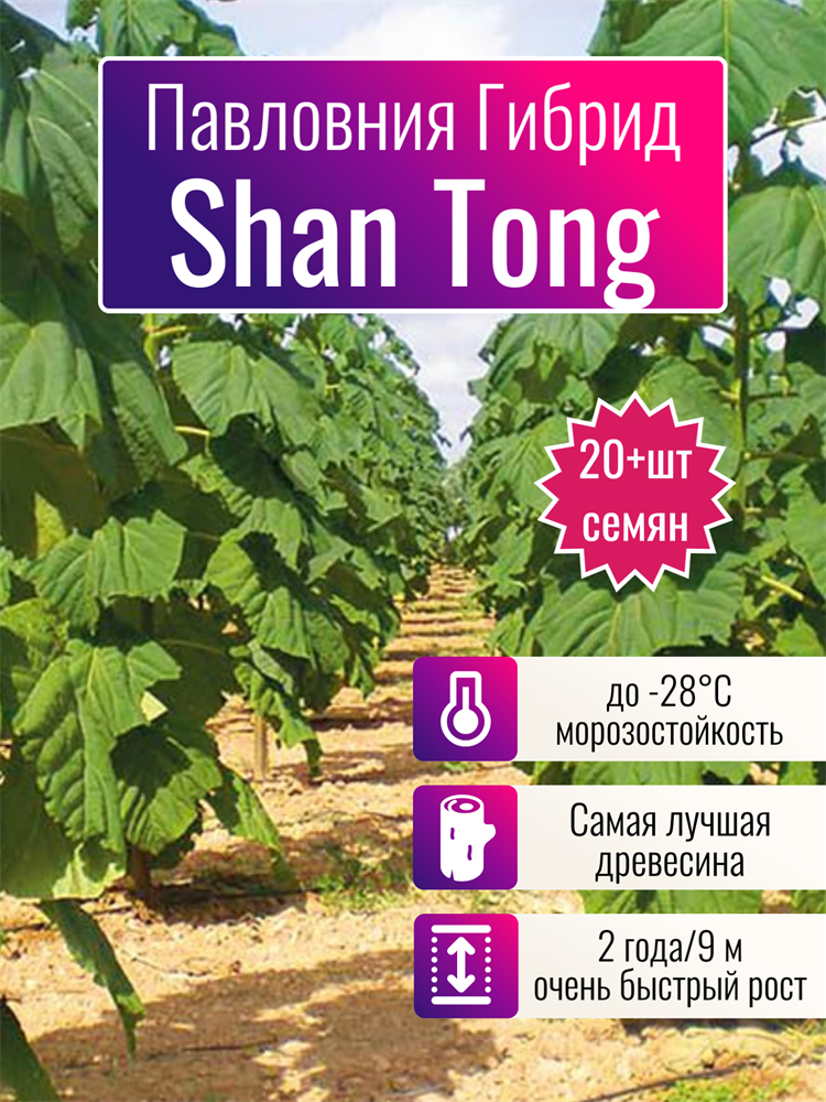 Shan Tong – это новейшая и улучшенная разновидность павловнии выведенная в Китае, которая имеет следующие преимущества по сравнению с другими видами павловнии: быстрый рост, сильная устойчивость к болезням и насекомым-вредителям, большая устойчивость к засухе и холоду, большой объем получаемой древесина, хорошее качество, сбережение площади земли за счет узкой кроны, исключительная приспособляемость, сильные способности к восстановлению и т. д.